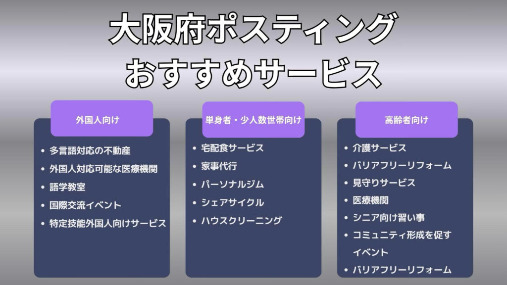 大阪府の人口・世帯構成の変化を踏まえると、ポスティングは以下の業種で特に効果を発揮する可能性を秘めています。